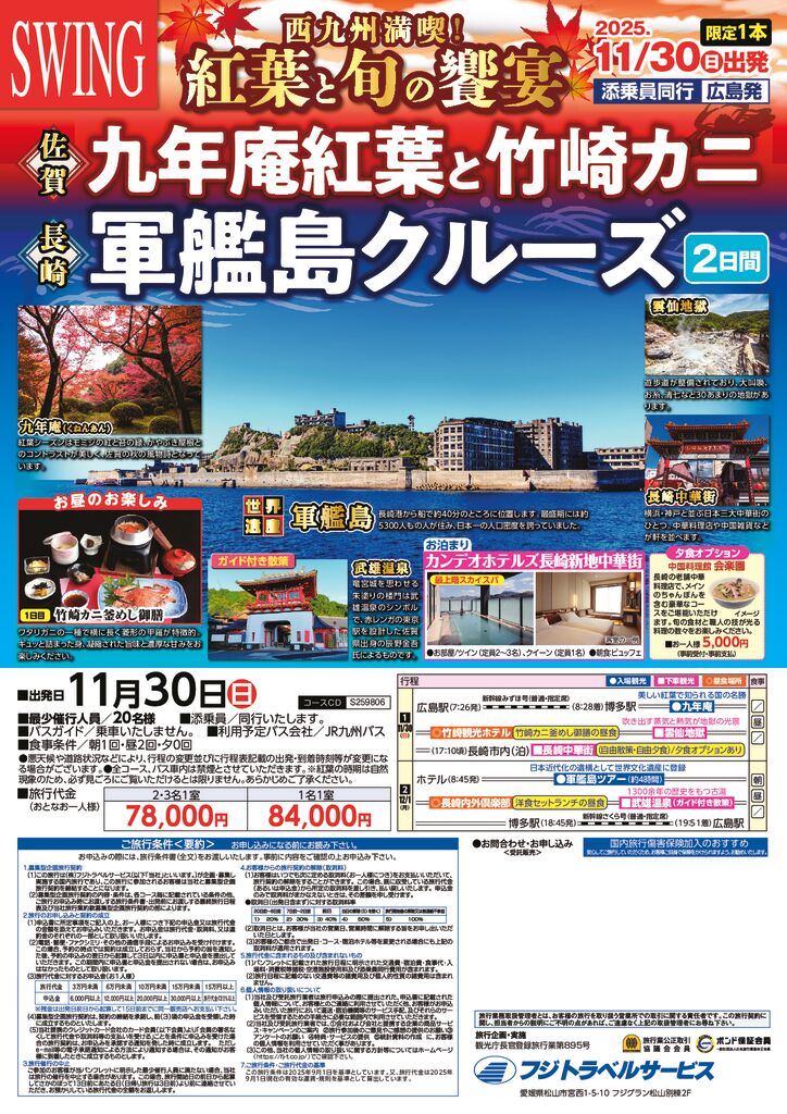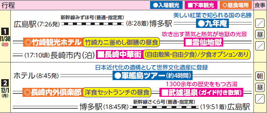 広島駅発【広島発着】九年庵紅葉と竹崎カニ軍艦島クルーズ2日間
