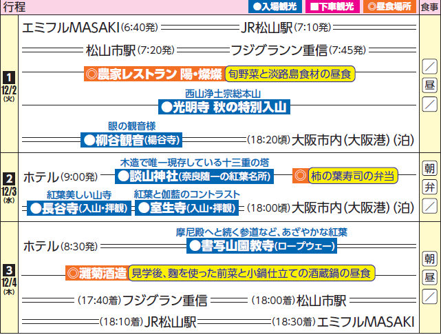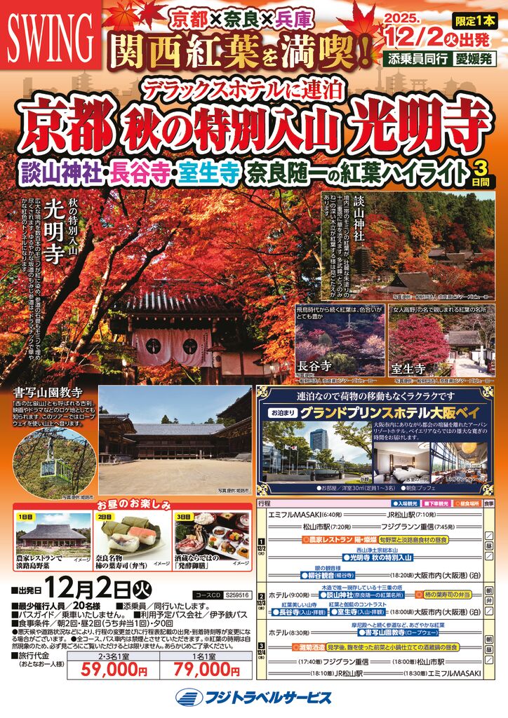 エミフル発 JR松山駅発 市駅発 FG重信発【中予発着】関西紅葉を満喫!デラックスホテルに連泊 京都秋の特別入山光明寺・奈良随一の紅葉ハイライト3日間