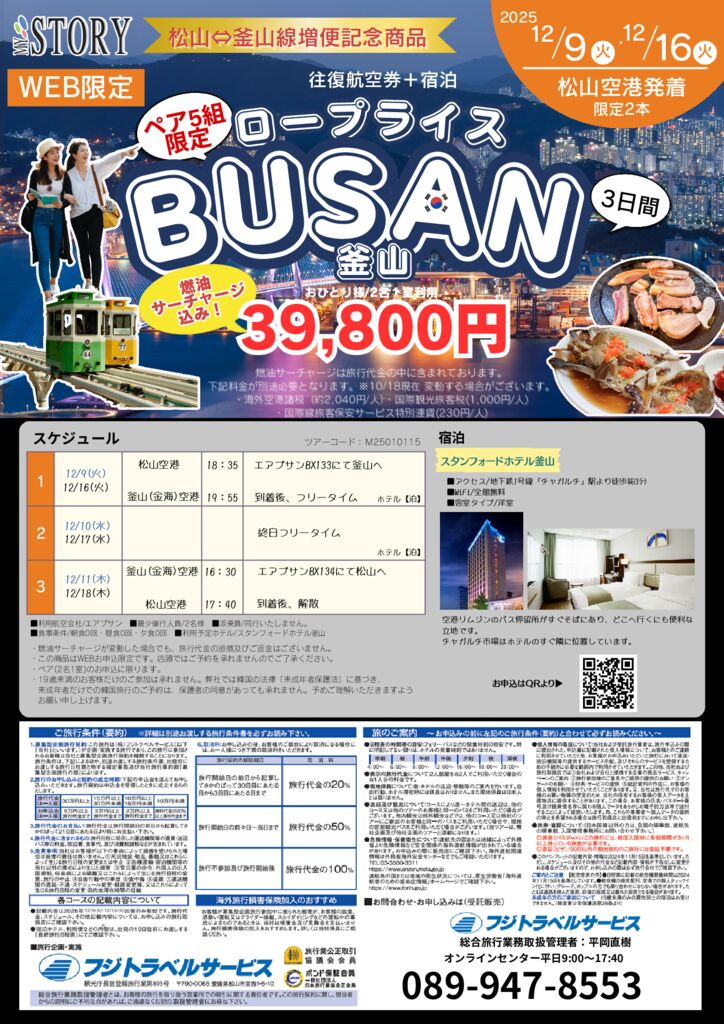 松山⇔釜山線増便を記念して、特別価格でご案内!燃油サーチャージが入ってこの価格はかなりお得の為、お早めにお申込ください♪