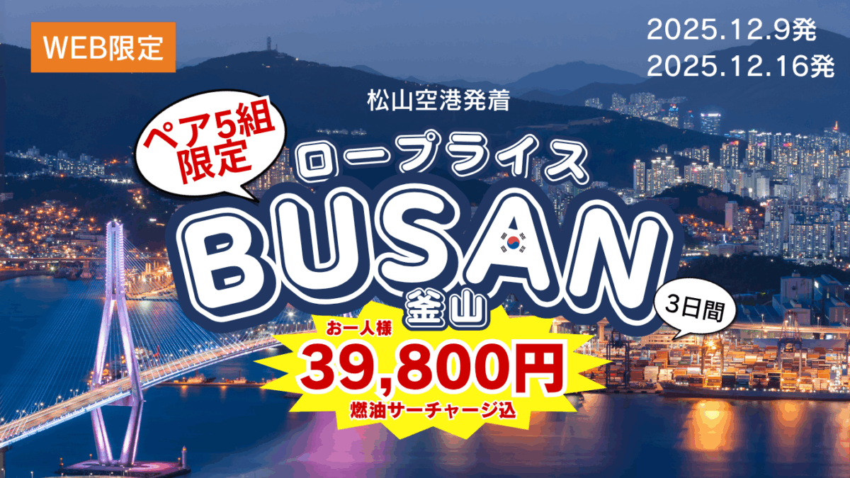 松山空港発*WEBお申込限定*【松山空港発着】12/9・12/16発 ロープライス釜山3日間