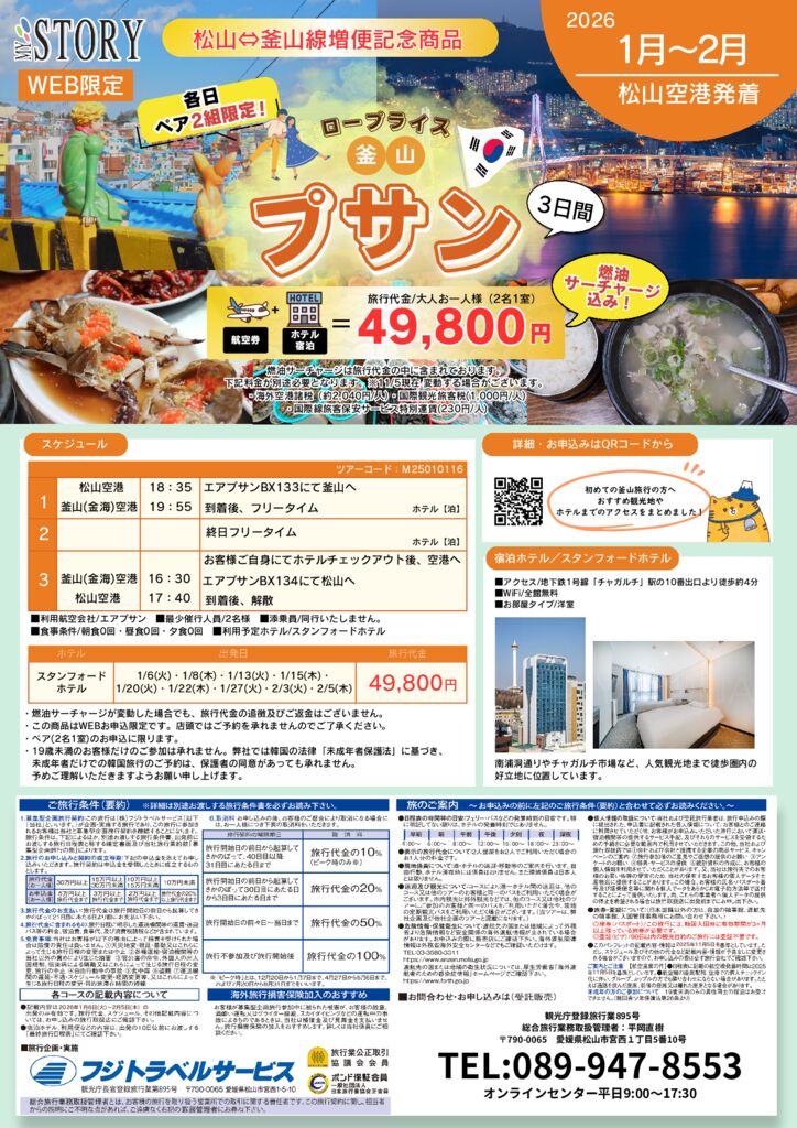 松山⇔釜山線増便を記念して、特別価格でご案内!燃油サーチャージが入ってこの価格はかなりお得の為、お早めにお申込ください♪
