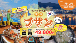 【新商品発売のご案内】 松山⇔釜山線増便を記念して、お得なツアーが登場! 松山空港発着✈️ ロープ