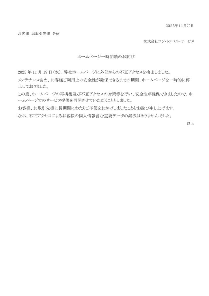 ホームページ一時閉鎖のお詫び | 総合旅行会社~国内旅行・海外旅行、団体旅行、宿泊予約など旅情報満載 | フジトラベルサービス