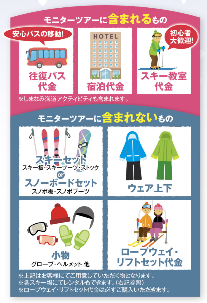 【含まれるもの】往復バス代金、宿泊代金、スキー教室代金、しなまみな海道アクティビティ代金