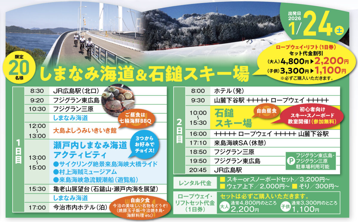 【広島発着:交通費無料!】愛媛県石鎚スキー場&しまなみ海道アクティビティ・モニターツアー2日間