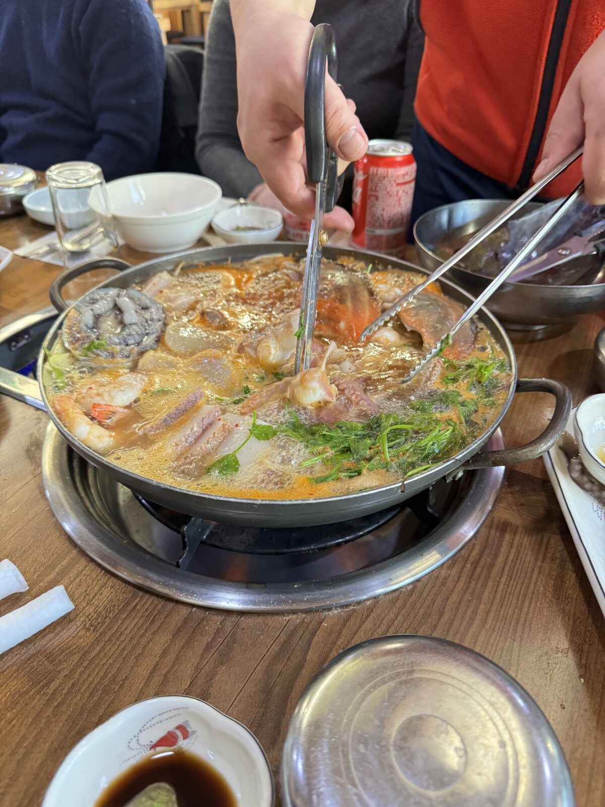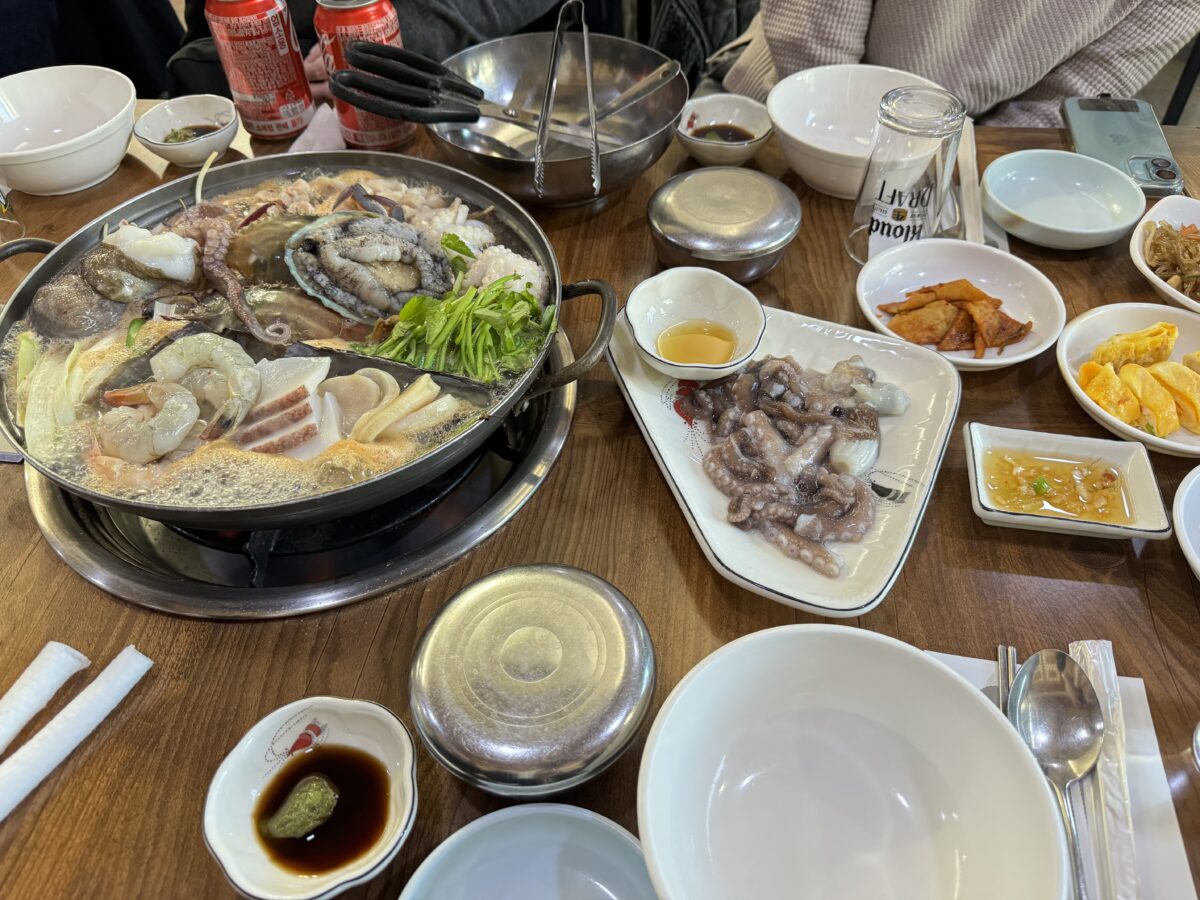 タコ・ホルモン・エビが入ったピリ辛鍋。