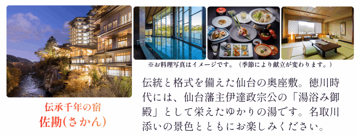 【3泊目】 秋保温泉|伝承千年の宿佐勘(花月館または山翠館/和室または和洋室または和ベッド)