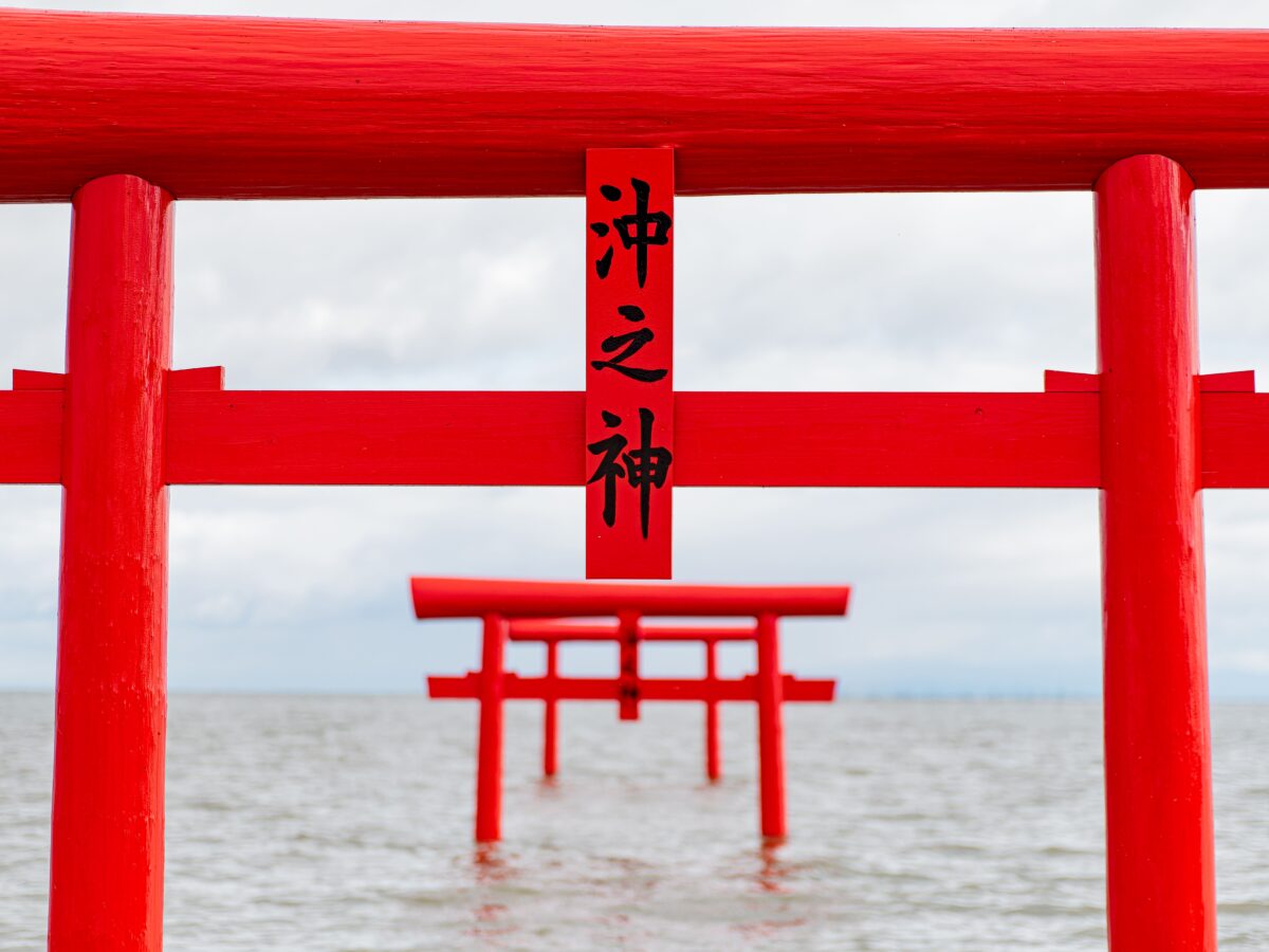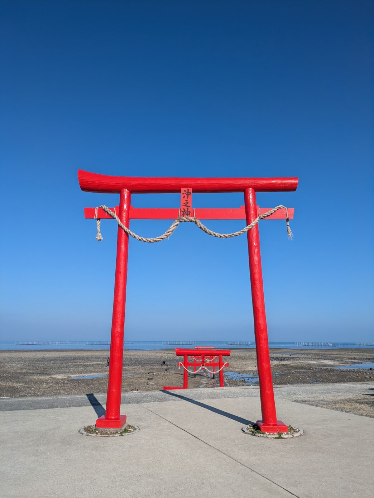私たちが訪れた時は、ちょうど海の中に朱色の鳥居がすっとなじむように並んでいて、その姿はまるで物語の世界。ゆらゆらと揺れる水面に映える赤色が本当に幻想的で、ただ眺めているだけで、ざわついていた心がすーっと浄化されていくような感覚になりました。