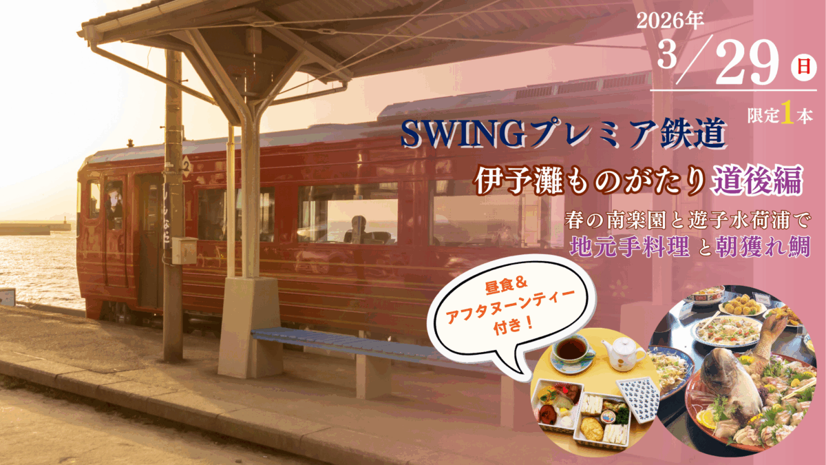 JR松山駅発【残席わずか】SWINGプレミア鉄道 伊予灘ものがたり 道後編 春の南楽園と遊子水荷浦 朝獲れ鯛 日帰り|2026年3月29日出発