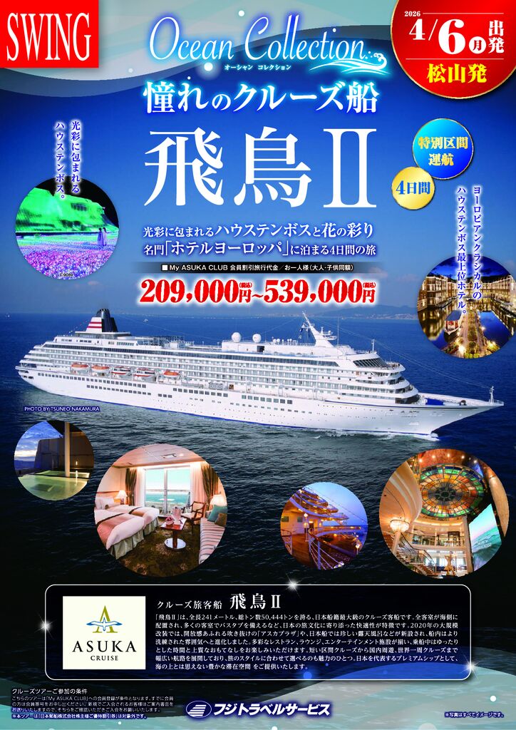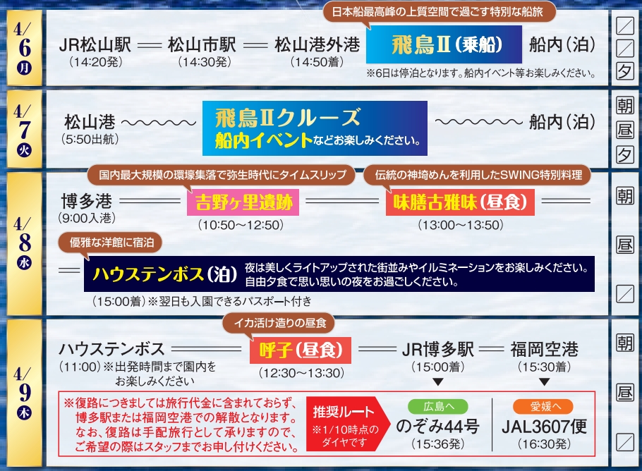 松山駅発 松山市駅発飛鳥Ⅱクルーズ ハウステンボス ホテルヨーロッパ 4日間|2026年4月6日出発