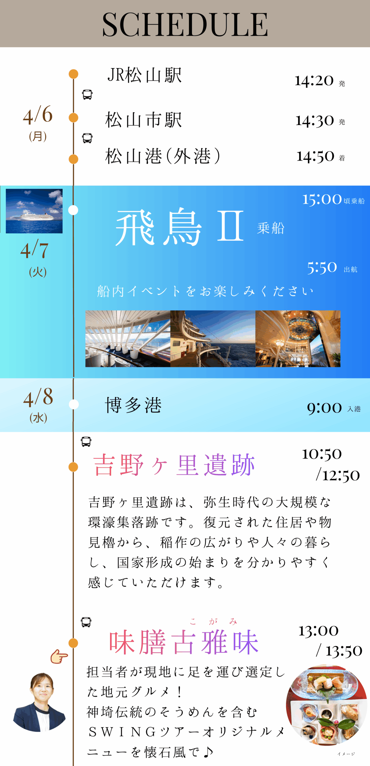1日目松山駅から最終日博多駅まで同行いたします。