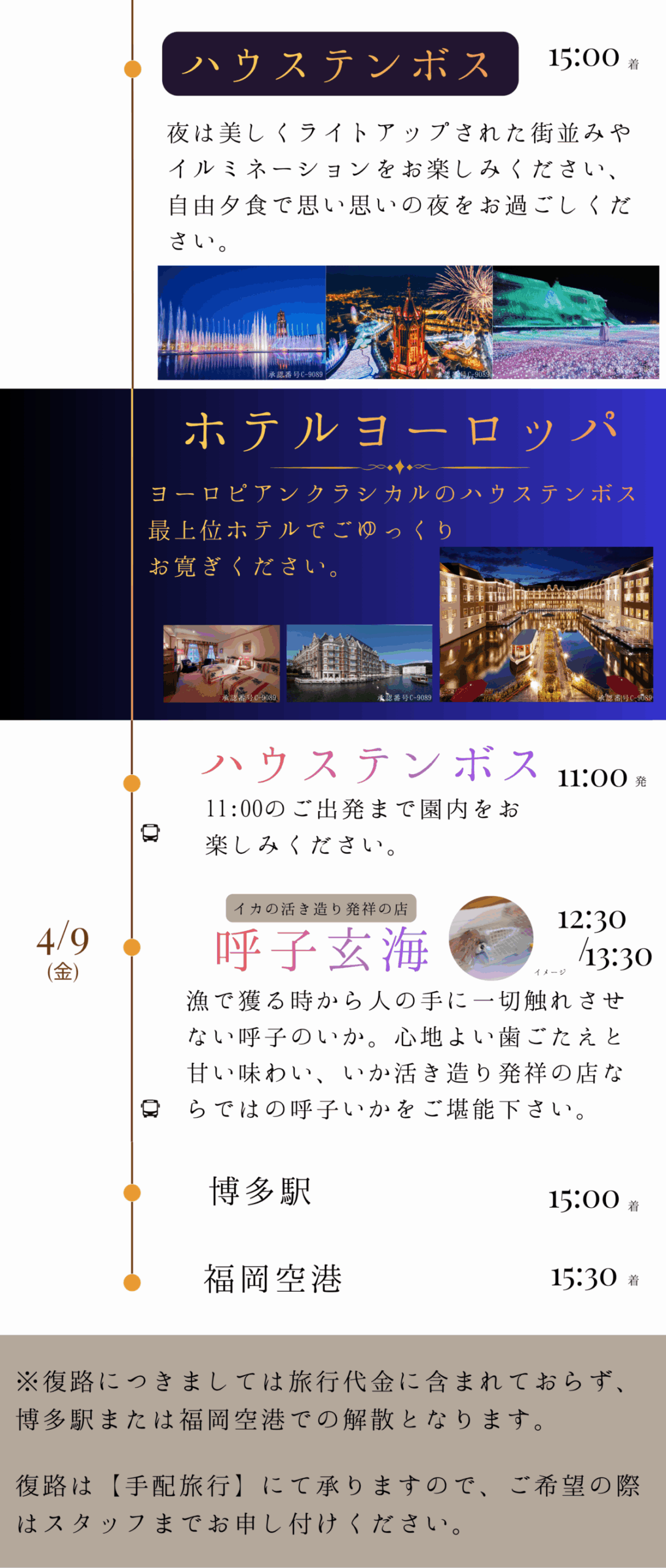- 本ツアーは博多発着の区間運航のため、松山での乗船時は宅急便をご利用いただくことができませんので、ご了承ください。当日は、お荷物を持ってご集合ください。