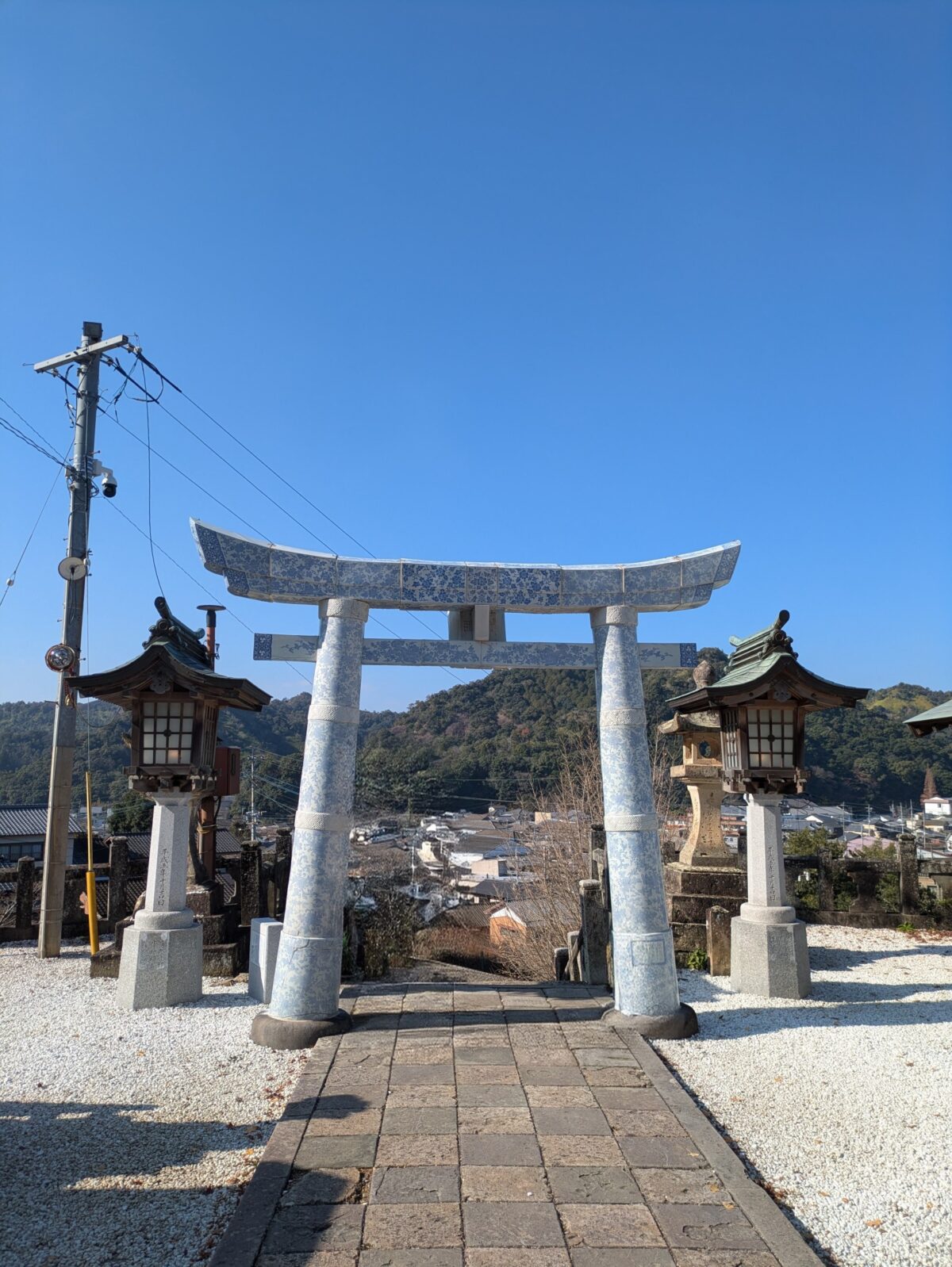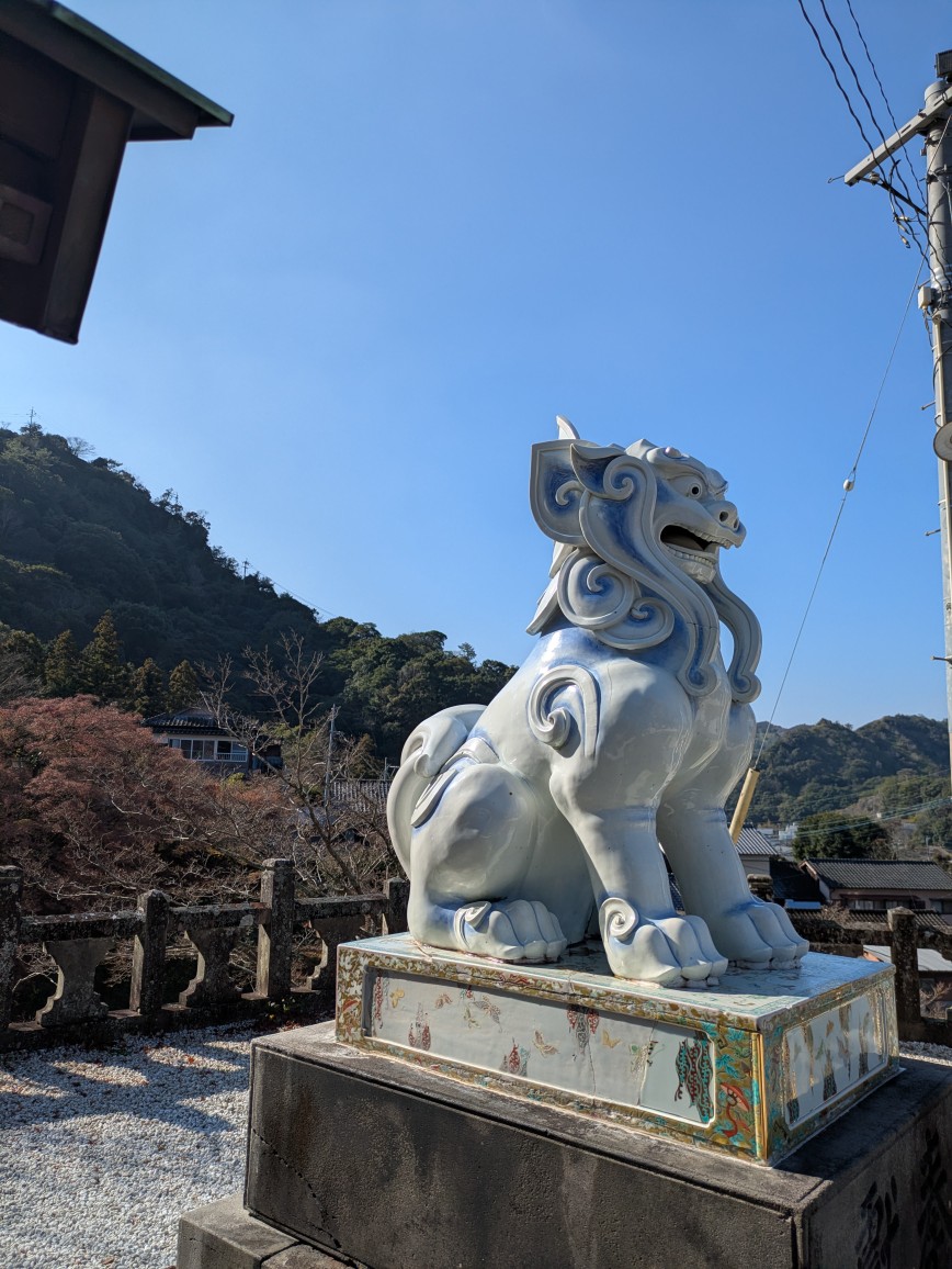 境内に入ると、陶器でできた鳥居や狛犬が迎えてくれます。白磁のやわらかな質感と光の反射が美しく、思わず足を止めて見入ってしまいました。