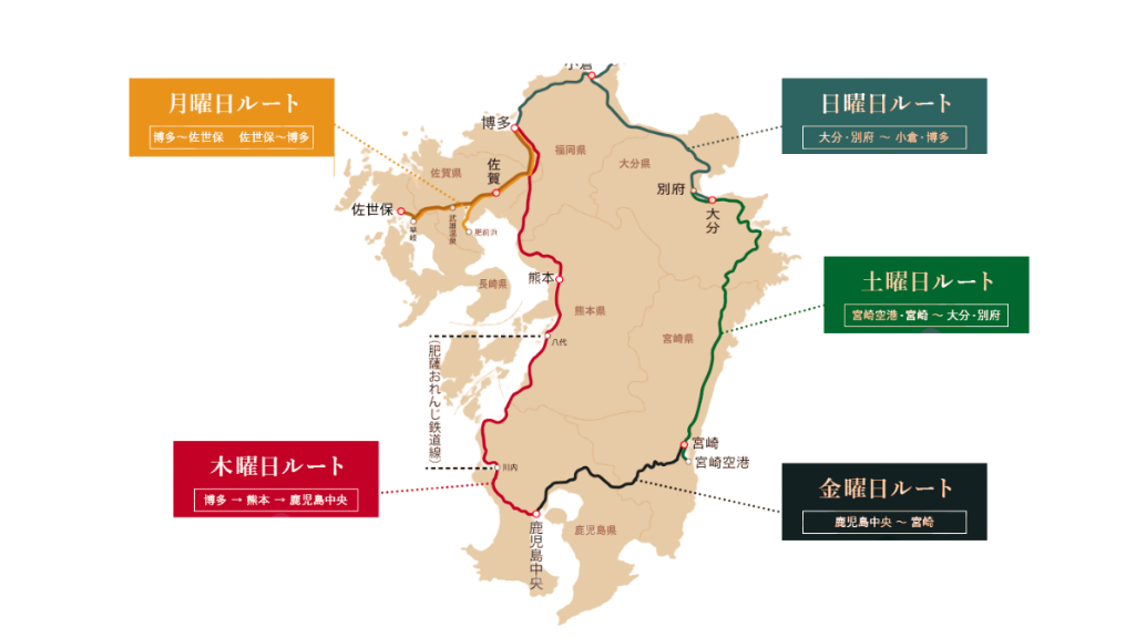 月曜日は、博多と佐世保を結ぶルート。博多駅を出発後、車内では昼食の人気駅弁*を楽しみながら、 ゆったりと列車の旅が始まります。