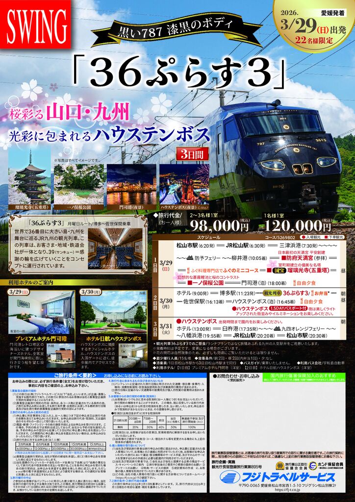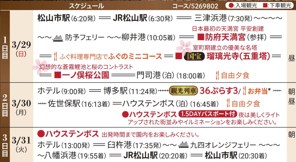 松山駅発/松山市駅発漆黒のボディ 「36ぷらす3」 桜彩る山口・九州 光彩に包まれるハウステンボス3日間|2026年3月29日出発