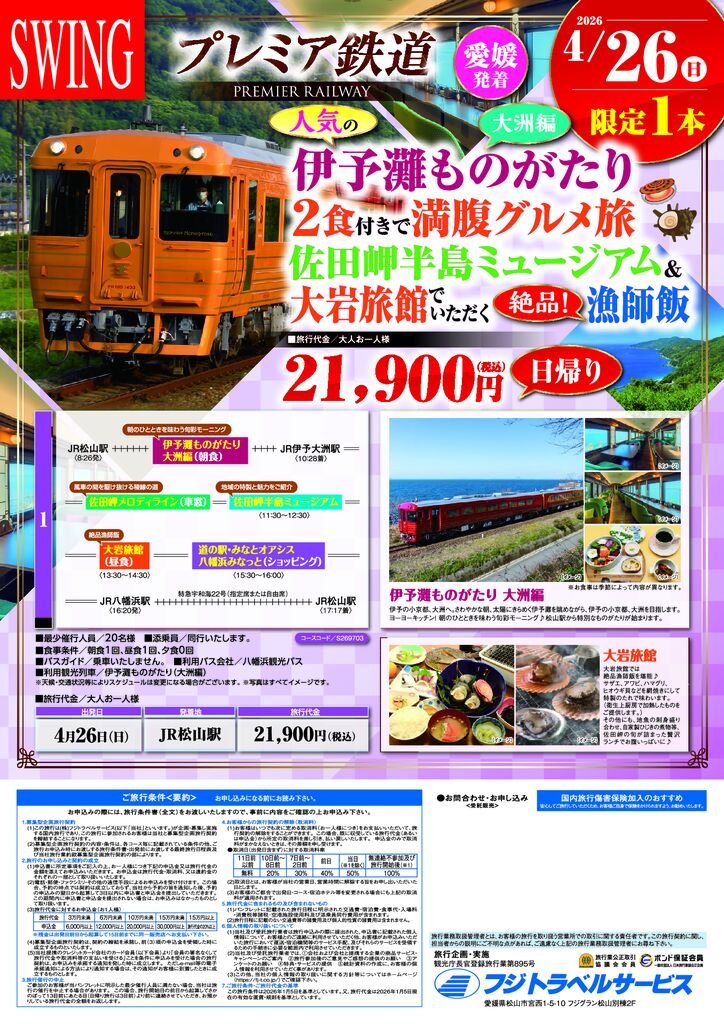 JR松山駅発伊予灘ものがたり 大洲編 2食付きで満腹グルメ旅 佐田岬半島ミュージアム&大岩旅館でいただく絶品漁師飯|2026年4月26日出発