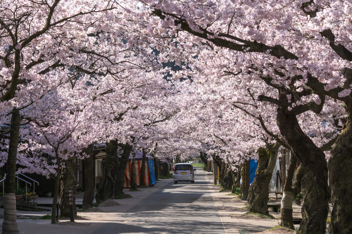 がいせん通りは、かつて宿場町として栄えた新庄村の中心に位置する歴史ある通りです。石畳の街道沿いには、往時の面影を残す建物が並び、春には通り一面を覆う桜並木が見事な景観を描きます。枝を張り巡らせた桜がつくる花のトンネルは、この地ならではの風情。ゆっくりと散策しながら、宿場町の歴史と季節の彩りを同時に味わえる名所です。
