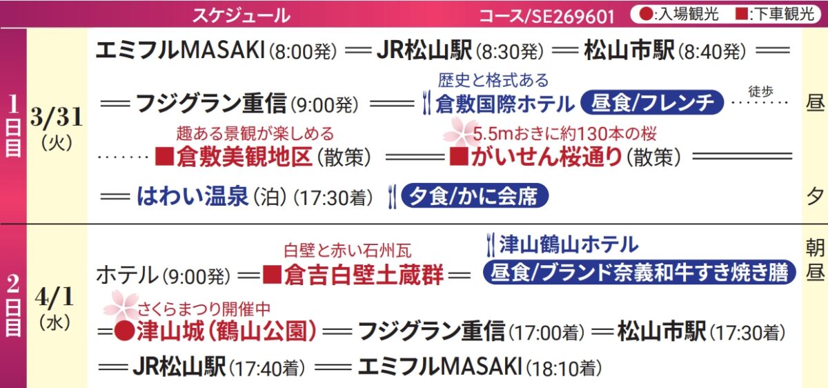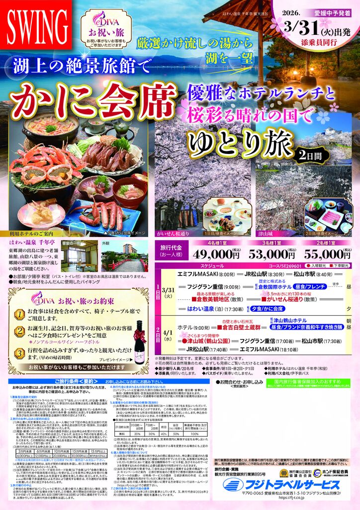 エミフルMASAKI発/JR松山駅発/市駅発/フジグラン重信発 フジのお祝い旅3月 湖上の絶景旅館でかに会席優雅なホテルランチと桜ゆとり旅2日間|2026年3月31日出発