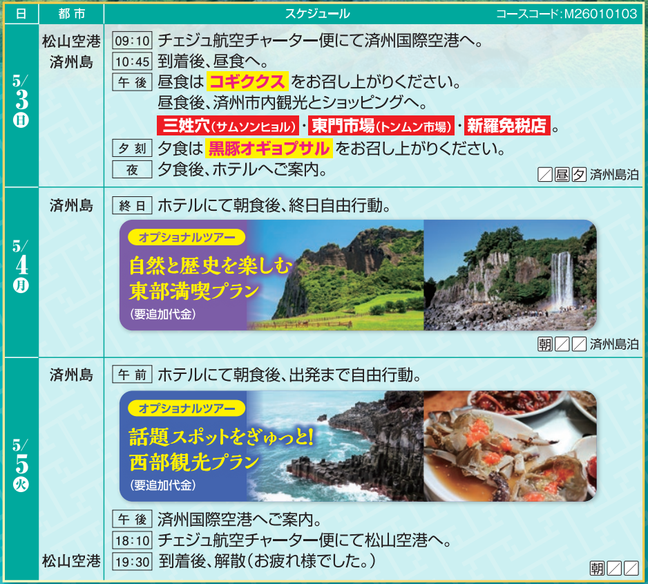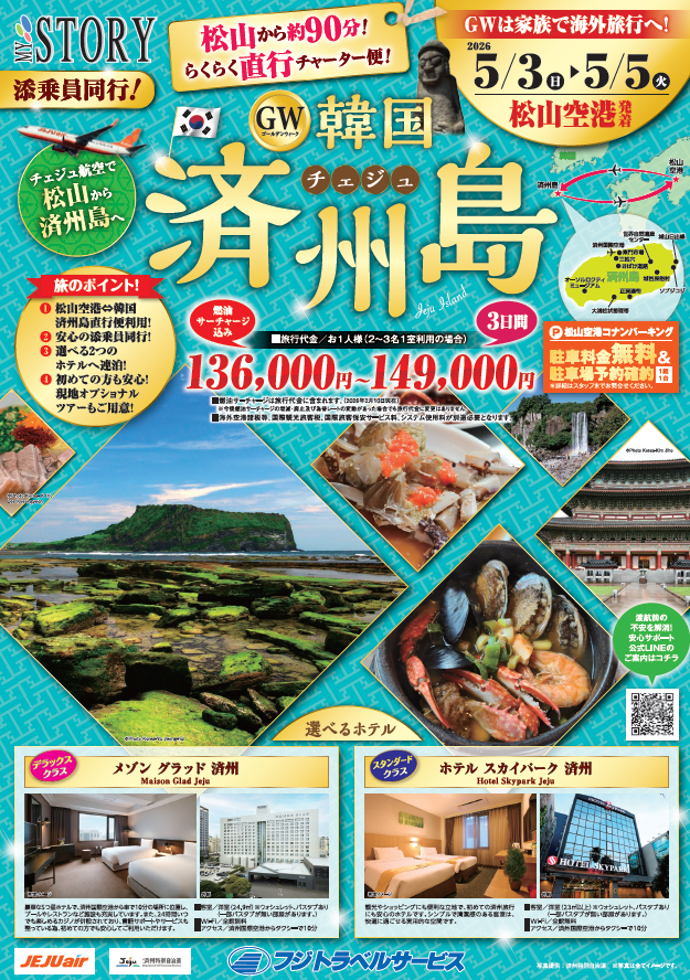 松山空港発着【松山空港発着】ゴールデンウィーク直行チャーター便で行く 韓国・済州島3日間|2026年5月3日出発