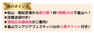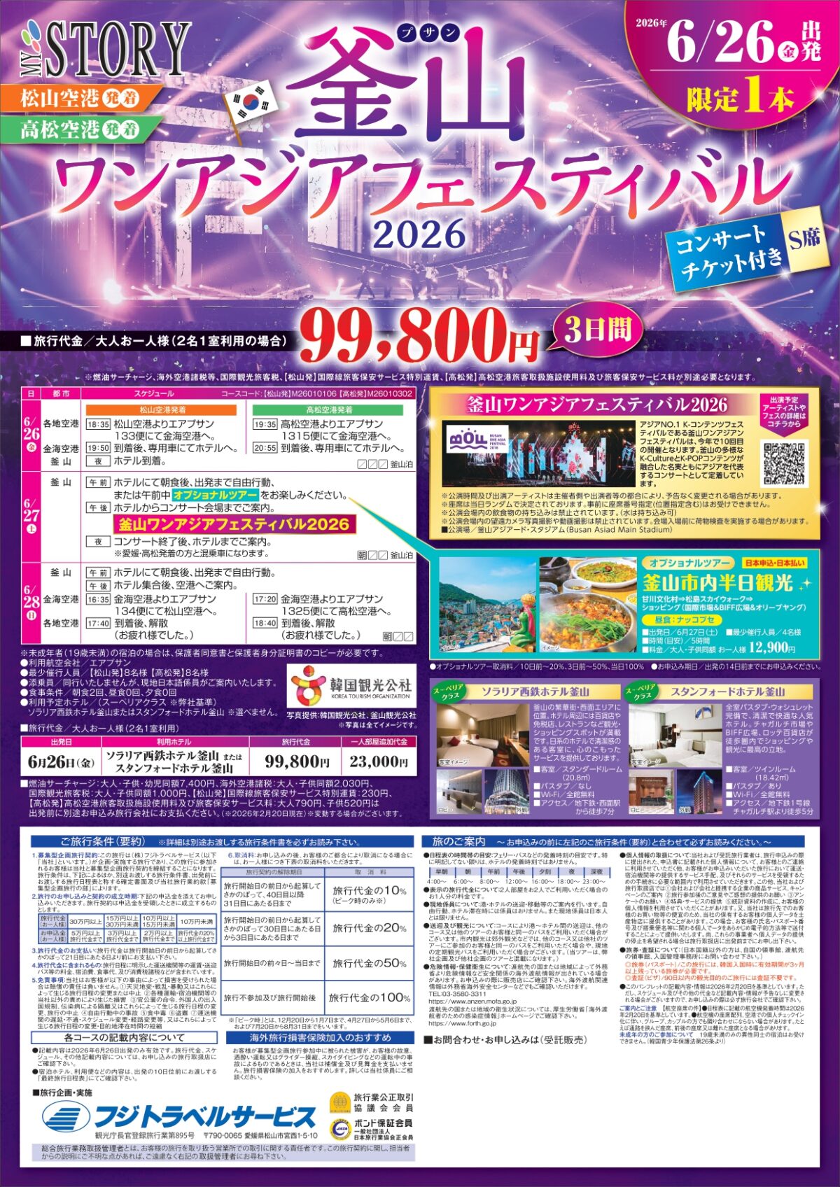 松山空港・高松空港発【松山空港/高松空港発着】6/26(金)発 \コンサートチケットS席付!/釜山ワンアジアンフェスティバル 3日間