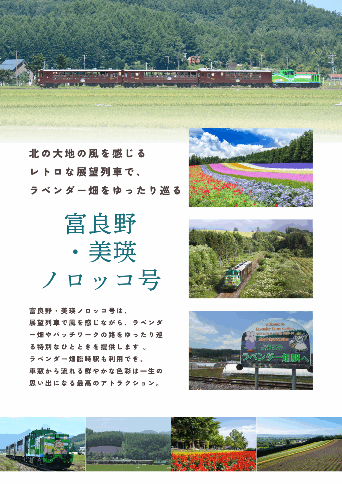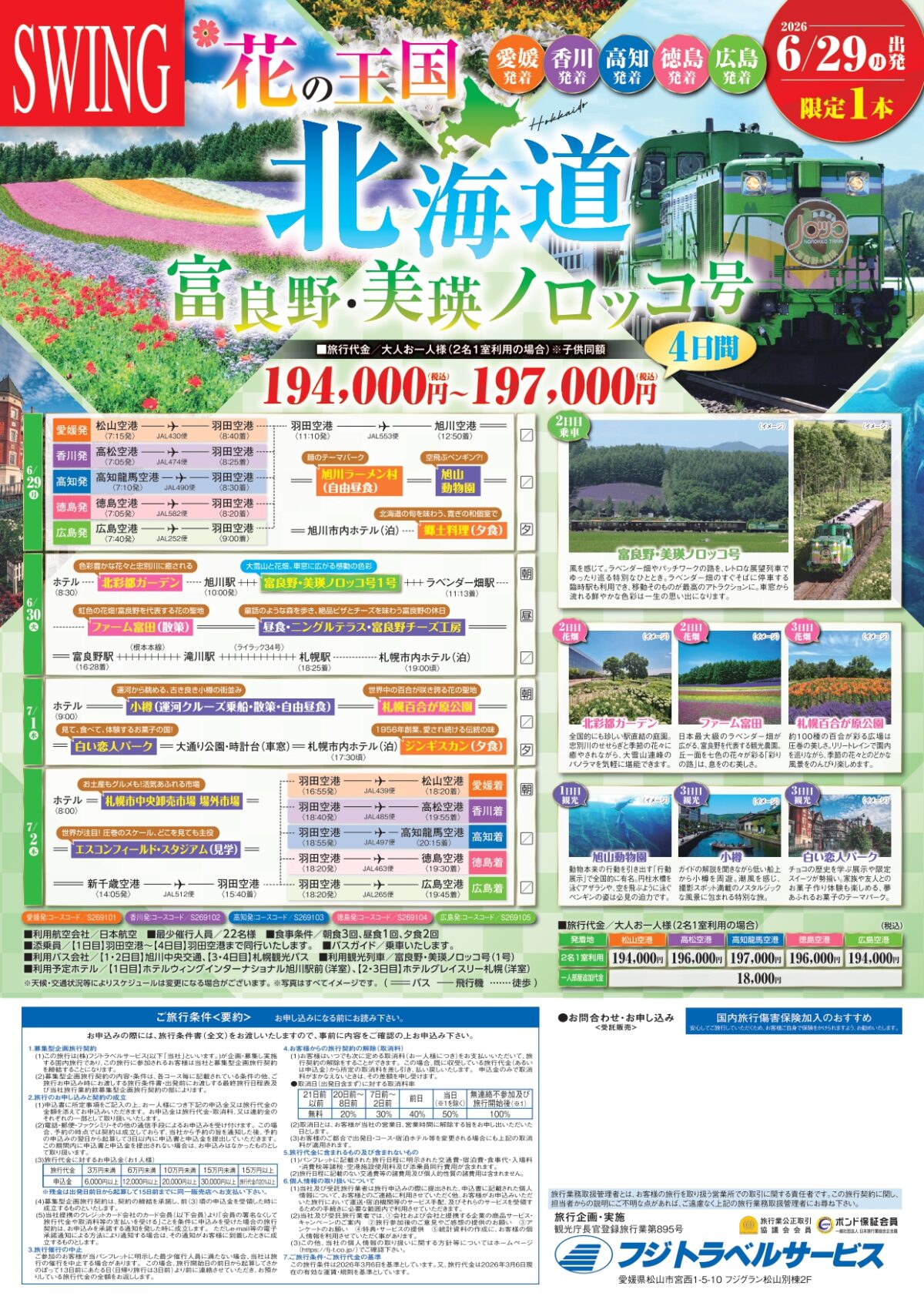 愛媛発・香川発・高知発・徳島発・広島発【愛媛・香川・高知・徳島・広島発】SWING プレミア鉄道 花の王国 北海道 富良野・美瑛ノロッコ号4日間(2026年6月29日出発)