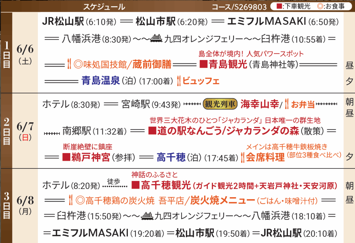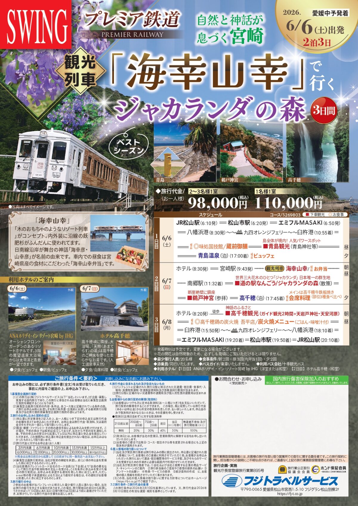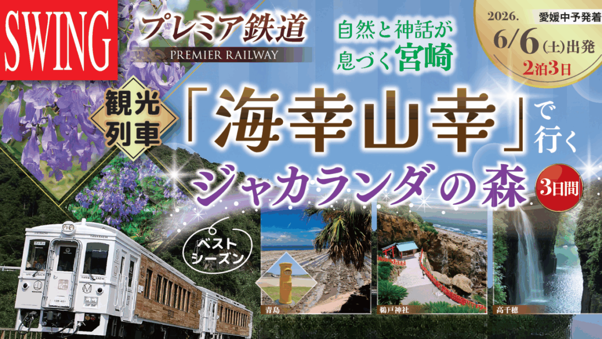 JR松山駅・松山市駅・エミフルMASAKI発【愛媛中予発着】SWING プレミア鉄道 観光列車「海幸山幸」で行く ジャカランダの森 3日間(2026年6月6日出発)