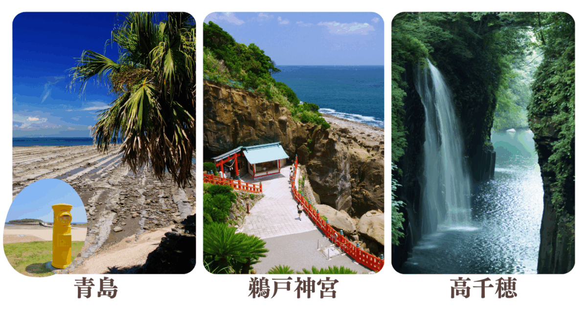 南国情緒あふれる景観が魅力の青島、海辺の断崖に鎮座する神秘的な鵜戸神宮、そして壮大な自然と神話の世界に包まれる高千穂。