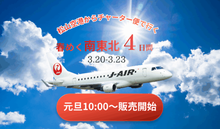 検索結果 出発地 愛媛県 高知県 香川県 徳島県 広島県 山口県 目的地 北海道・東北エリア 関東・甲信越エリア 中部・北陸エリア 近畿エリア 中国地方エリア 四国エリア 九州エリア 沖縄エリア 東京ディズニーリゾート® ユニバーサル・スタジオ・ジャパン 出発月 1月 2月 3月 4月 5月 6月 7月 8月 9月 10月 11月 12月 ワード 松山空港発 【松山空港発】J-AIRチャーター便で行く春めく南東北 天童・東山・秋保 3名湯 会津… 南東北SWINGチャーター温泉添乗員同行松山空港発着周遊プラン飛行機プラン 松山空港発 【松山空港発着】2026年1月~3月 エアプサンで行く はじめてのプサン3日間 釜山プサン韓国マイストーリーツアー松山空港発着 【愛媛・香川・広島発】1~3月設定 ルネッサンスリゾート沖縄に連泊!紺碧の海とやんばる… 高松空港発着SWING沖縄添乗員同行松山空港発着周遊プラン広島空港発着飛行機プラン JR松山駅発 *催行決定あり!*WEB申込限定【1~2月/JR松山駅発着】旬のいちごスイーツと三次ワ… いちご狩りいちごパフェ千光寺平田観光農園三次ワイナリー広島WEB申込限定ツアー松山発イチゴSWING催行決定WEB申込限定日帰り添乗員同行バスツアー JR松山駅発 WEB申込限定【2/11(水・祝)JR松山駅発着】牧野植物園ラン展と土佐グルメランチ&… 牧野植物園西島園芸団地WEB申込限定ツアー松山発高知SWINGWEB申込限定日帰り添乗員同行バスツアー 松山駅発 松山市駅発 松山空港発 \\催行決定!//【フジのクルーズ旅】憧れのクルーズ 飛鳥Ⅱ 梅香る四日市・横浜クルー… フジのクルーズ旅飛鳥ⅡSOCSWING OCEAN COLLECTION高知発催行決定ツアー松山発クルーズ催行決定 【松山空港発着】2/15(日)発 琉球神話を巡る沖縄本島縦断の旅 オーシャンリゾートス… SWING沖縄添乗員同行松山空港発着飛行機プラン 愛媛発・香川発・高知発・広島発 \\催行決定!//【愛媛・香川・高知・広島発】SWING プレミア鉄道 汽笛と氷のきら… 催行決定ツアーSWINGプレミア鉄道プレミア鉄道プレ鉄列車の旅添乗員同行北海道 松山空港発 *催行決定あり!*松山⇔釜山線増便記念!ロープライス釜山3日間【2026年1月~2月出… 釜山韓国マイストーリー催行決定あり松山空港発着フリープラン JR広島駅 ※催行決定※キャンセル待ち【広島発】1/17(土)発 SWINGプレミア鉄道 etSE… 催行決定ツアーSWINGプレミア鉄道プレミア鉄道プレ鉄列車の旅添乗員同行 中四国発 ≪10~3月≫【選んで創る旅 山陽】山口 長門湯本・湯田・下関つくの温泉 フェリーセットプラン山陽山陰宿泊プラン個人旅行フリープラン 中四国発 ≪10~3月≫【マイカーで行く】山陰 島根・鳥取 山陽山陰マイカープラン宿泊プラン個人旅行フリープラン 1 / 3123»